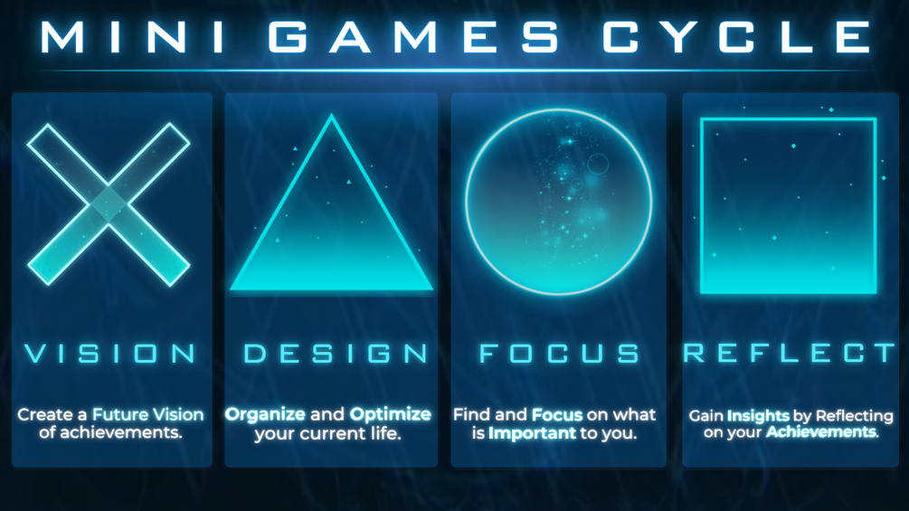 Vision: Just like in games where you set out on epic quests, the Vision games help you craft a clear picture of your future. You’ll create a vision board in 3 key stages and set long-term goals, clarifying your purpose in life.