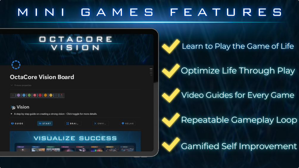 • Life Game Design is the only Notion template that incorporates game design principles to make self-improvement engaging and rewarding. It includes frameworks like Achievements, Mini Games, and the OctaCore Framework, and also comes with the world's first gamified Notion tutorial course!
